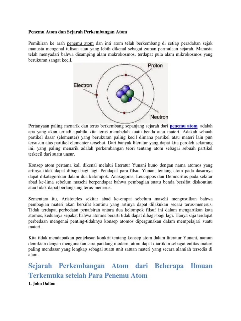 Kata atom juga berasal dari bahasa yunani atomos yang artinya 'tidak dapat dibagi lagi'. Kelemahan struktur atom niels bohr: Model atom rutherford gagal menjelaskan tentang kestabilan atom dan terjadinya spektrum garis atom hidrogen. Pada setiap kulit atom terdiri atas subkulit yang merupakan kumpulan orbital (tempat kebolehjadian ditemukan adanya elektron). Hal ini juga yang membuat efek ini tidak dapat dibuktikan secara lebih jelas. Menurut bohr, cahaya akan diserap atau diemisikan dengan frekuensi tertentu (sesuai persamaan planck) melalui peralihan elektron dari satu tingkat energi ke tingkat energi yang lain. Kata atom juga berasal dari bahasa yunani atomos yang artinya 'tidak dapat dibagi lagi'. Setelah model atom bohr, heisenberg mengajukan model atom yang lebih dikenal dengan model atom mekanika gelombang atau model hatom modern.. Teori atom berawal dari pandangan democritus, seorang ilmuwan dari yunani.